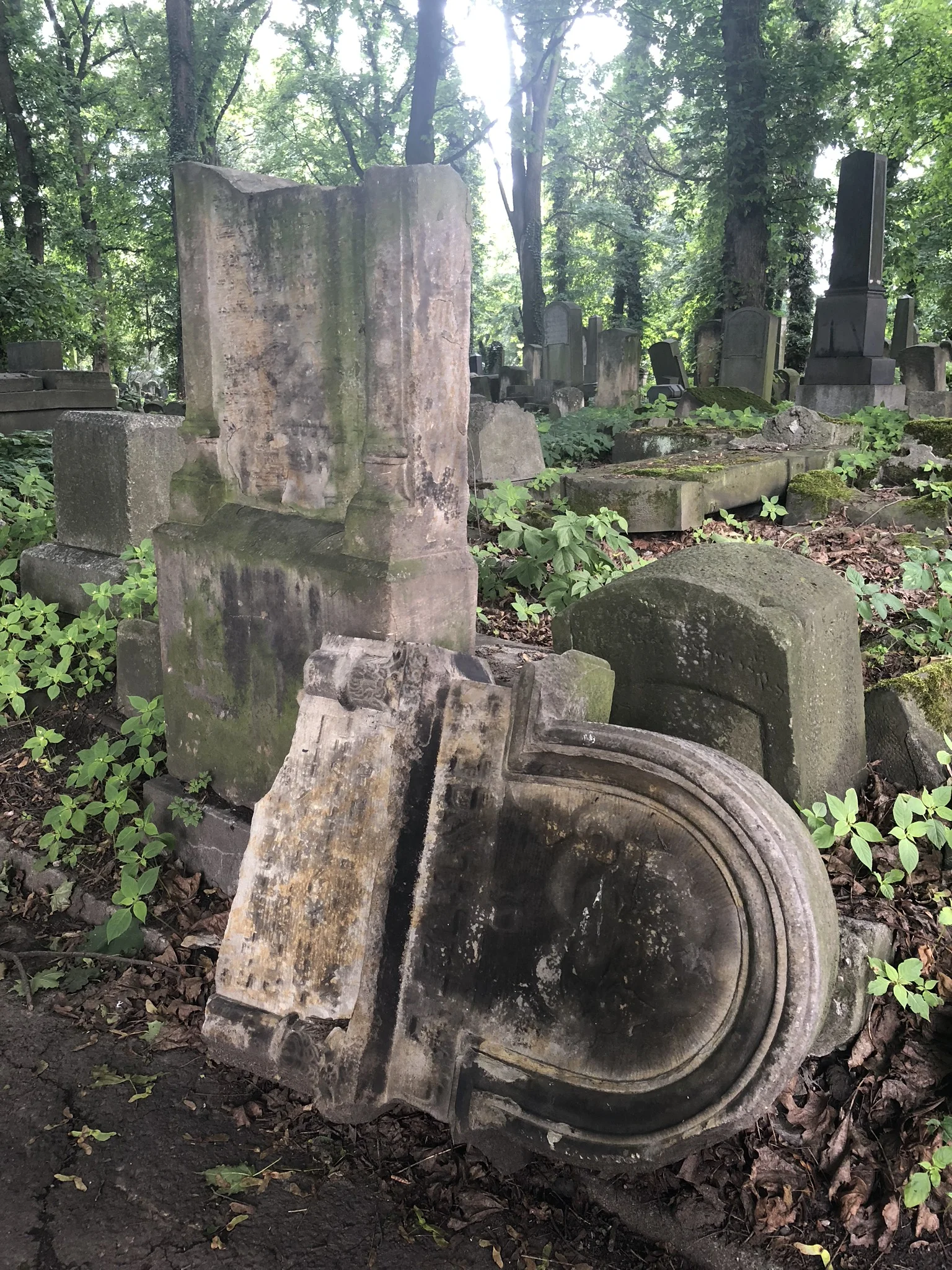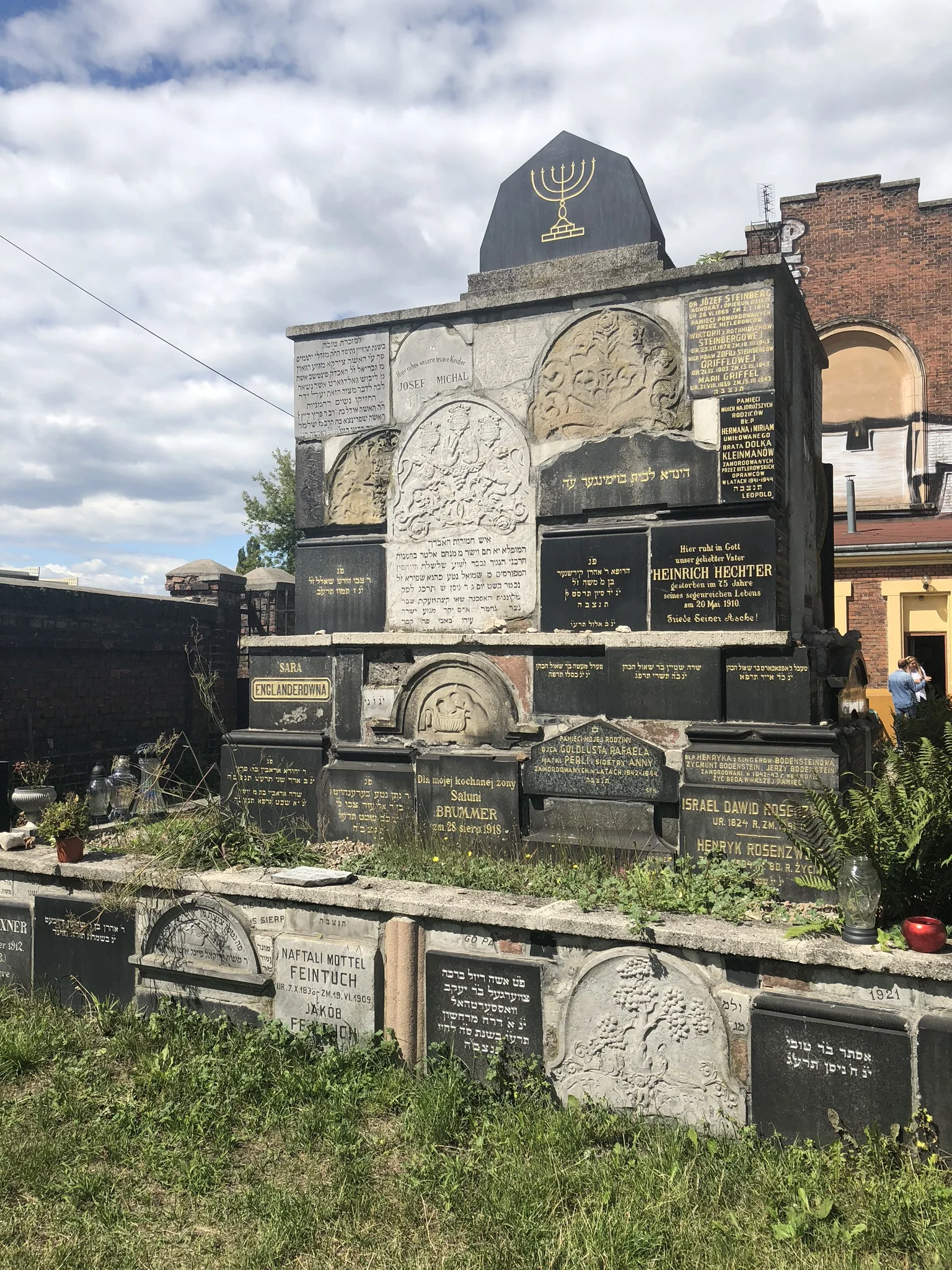 Afterwards, we walked to the nearby Jewish quarter and stopped for lunch. We had pierogis (naturally), with cabbage roll filling, the most delicious pork chop, known as a Kolet Schabowy, which was served like a schnitzel, and blueberry and strawberry filled pierogis for dessert. We then found the Jewish cemetery where Colin was given a skullcap to wear, known as a Yarmulke or Kippah. This cemetery was destroyed during the war and its tombstones were often used as paving stones. This meant that most of the graves in it were newer. However, many fragments of tombstones that were destroyed, were recovered and used to build the wall surrounding the cemetery as a memorial.